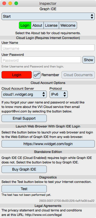 The Start inspector first shows when you begin to use Graph IDE. It consists principally of the Login editor. The login editor can also be accessed by selecting the Login button in the Status Bar.
