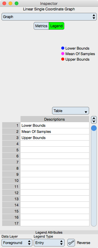 Legend Group : The legend is a Group Graphic and is built automatically using the attributes specified below. Once the attributes below are specified then drag the legend near your graph on the document's Graphic View as it is also an element of a Palette. The legend is set to drag and drop to the overlay layer of the graphic view and not the data layer of the graph.